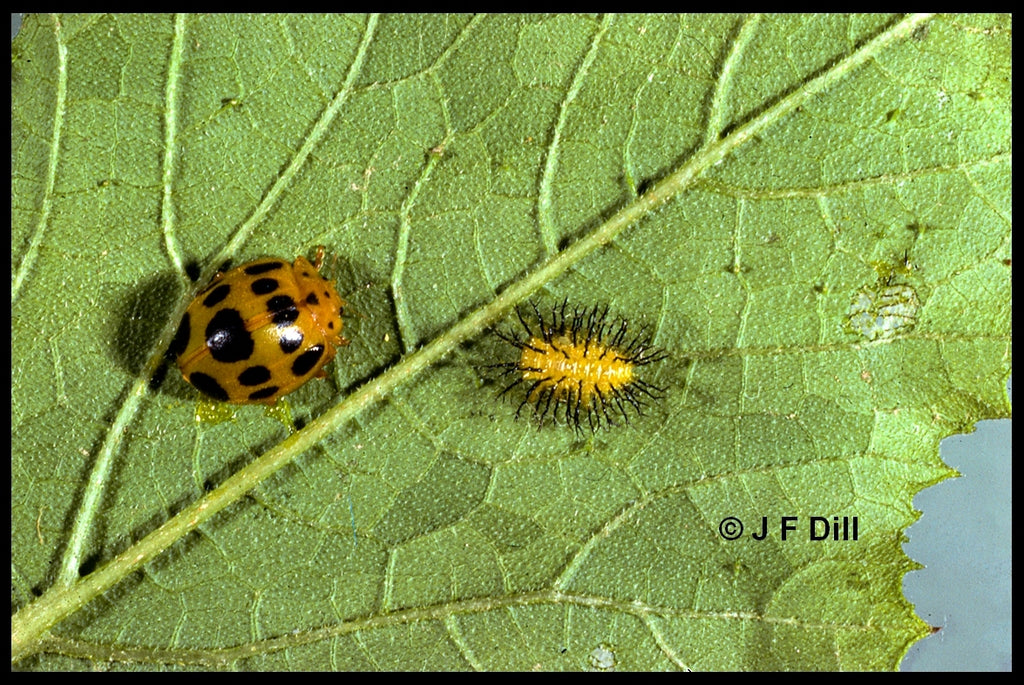 Squash beetles are scientifically known as Epilachna borealis. These are distinct from squash bugs (Anasa tristis), which we’ll discuss in a future blog. Squash beetles are brightly colored, and are often mistaken for ladybugs—but don’t be fooled. While ladybugs are a wonderful helper in the garden, squash beetles cause nothing but trouble. Squash beetles are shaped a bit like ladybugs, but they’re yellow or orangeish in color with seven black spots on their backs. They eat the leaves, flowers, and occasionally the young fruit of squash, cucumber, and melon plants. The damage they cause is distinctive: they eat away the green parts of the foliage and leave behind a skeleton-like patch of veins and supportive tissue.
