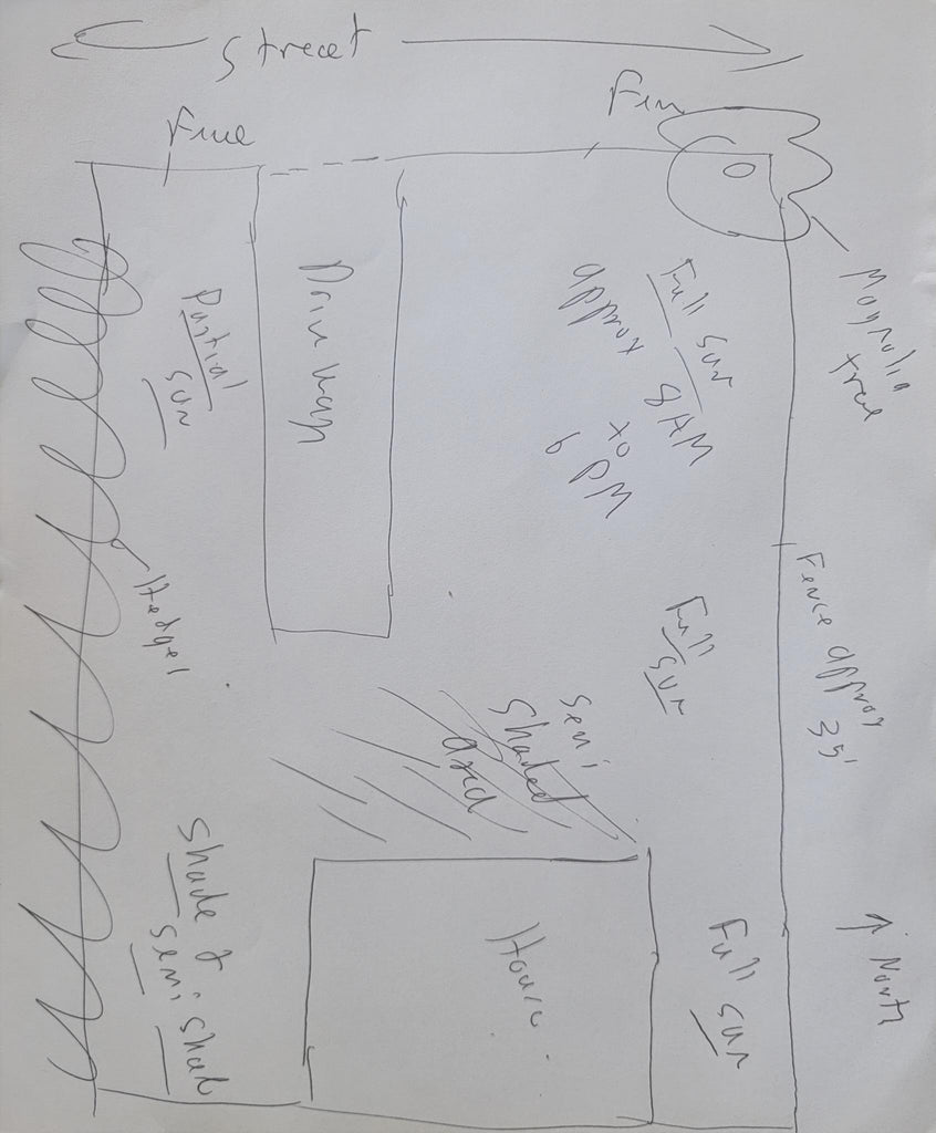 - First things first: sketch the overall layout of the property, including where your house, driveway, walkway, and any outbuildings are. Nothing’s more frustrating then laying out a great sun map, picking the perfect spot for your raised beds, and then remembering that there’s already a shed or patio in that spot!